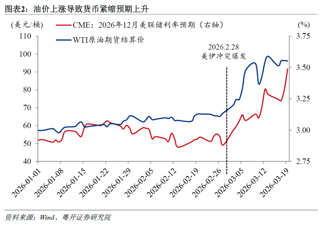 一是地缘局势增大全球通胀及利率上行风险,导致金价承压。伊朗局势已持续三周,市场对冲突长期化的担忧升温,持续推升油价。3月以来截至19日,WTI和布伦特原油价格已累计上涨40-50%,迪拜原油现货更是暴涨134%。油价上涨势必增大全球经济“滞胀”风险,但对于“滞”与“胀”的影响程度、顺序存在差异,现阶段更多体现在通胀上升与货币紧缩风险。美联储3月议息会议上修通胀预测,但几乎不改失业率与经济增长预期,鲍威尔讲话强调降息须以通胀放缓为前提,整体释放鹰派信号。同时,市场加大对欧元区及英国货币紧缩风险的关注。芝加哥商品交易所(CME)数据显示,市场不再预计美联储今年上半年降息,反而出现约10%的加息概率;对于年内降息的预期也显著下降。黄金作为无息资产,其持有机会成本高度取决于资金成本与利率水平,继而直接受到美欧货币紧缩预期升温的冲击。